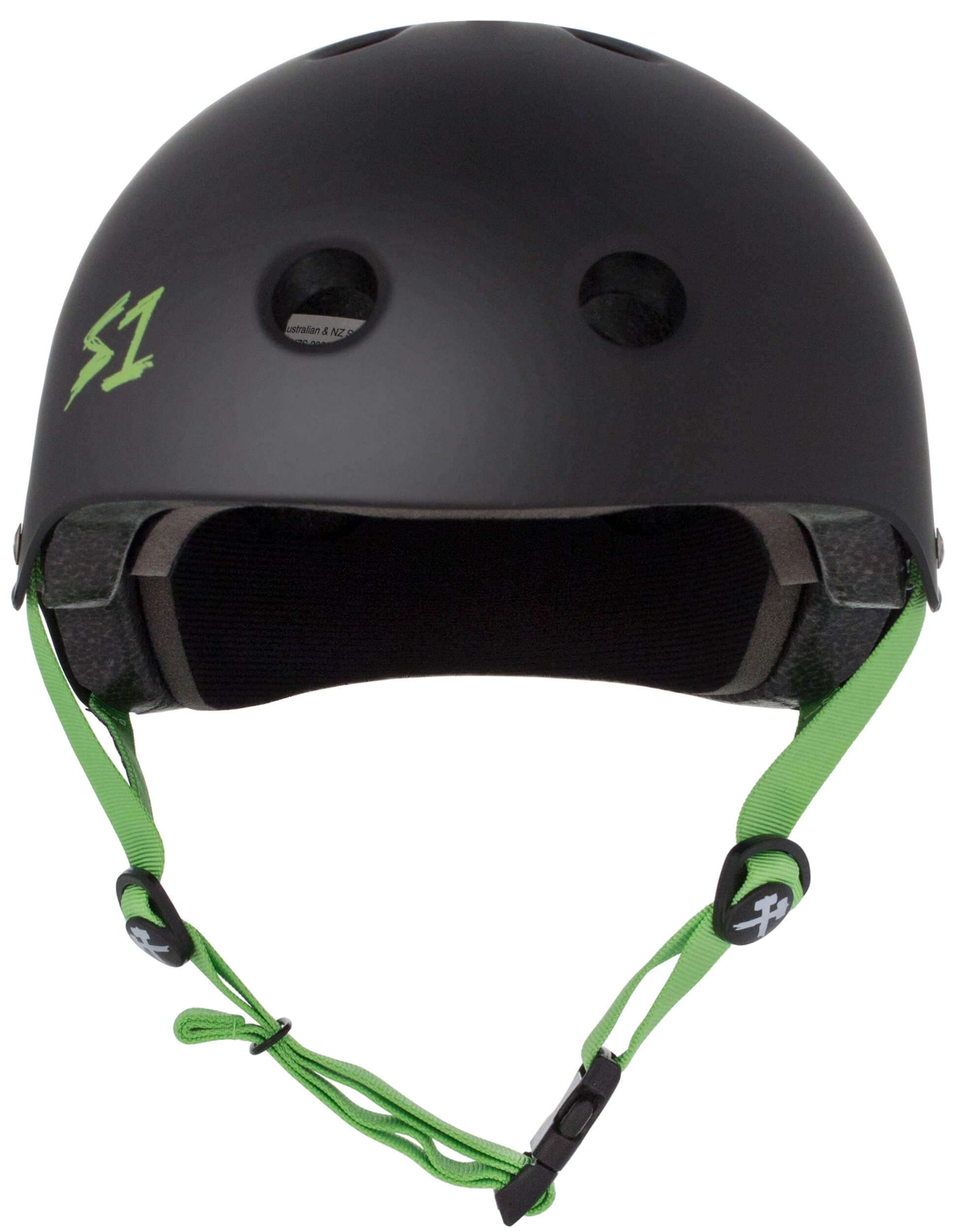 The S1 Lifer Helmet Black Matte w/ Bright Green Straps is certified to protect for skateboarders, pedal cyclists, roller skaters and non motorized scooters