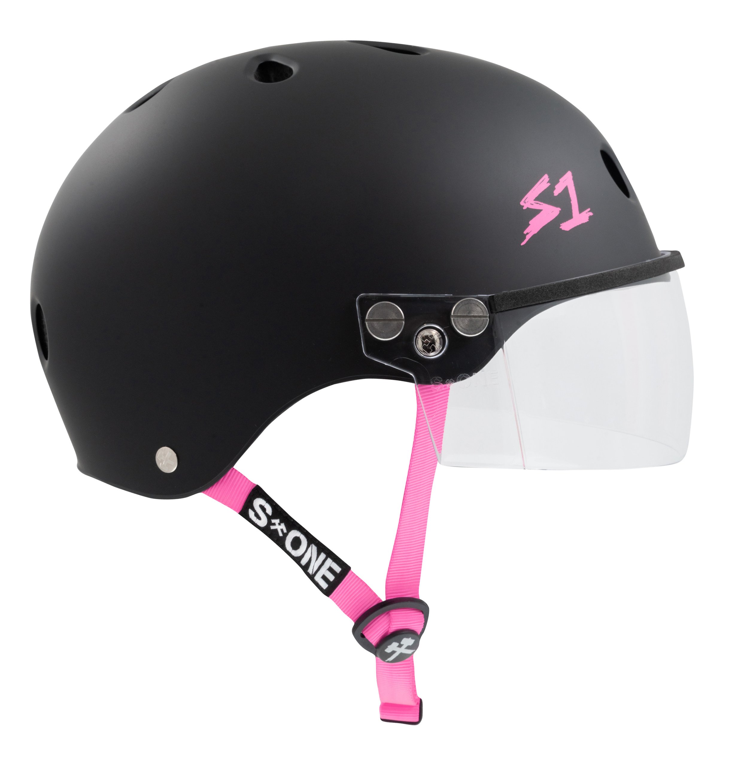 The S1 Lifer Visor Helmet Black Matte w/ Pink Straps is certified to protect skateboarders, cyclists, roller skaters, roller derby players and non motorized scooters. This is the second edition of this product and has been completely redesigned from the original version.